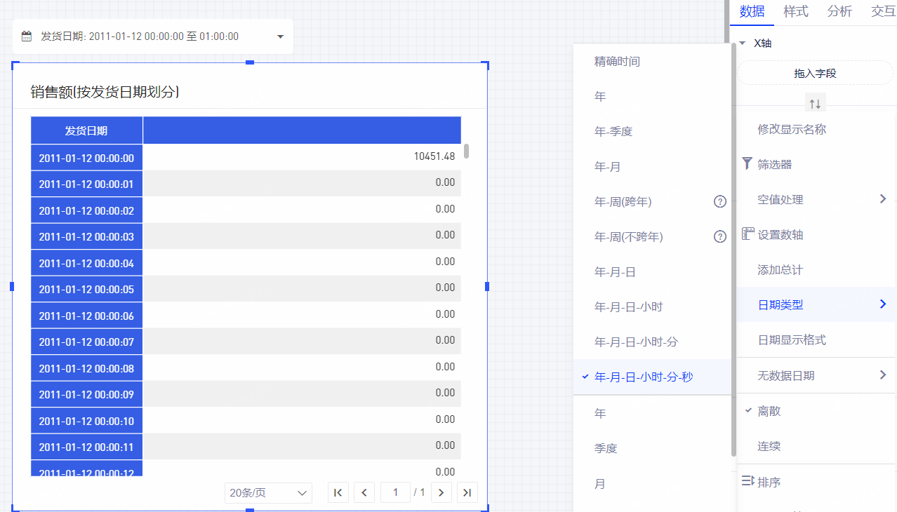(2)日期字段的无数据日期设置:新增补齐所有选中日期数据;并增加对「年-月-日-时-分-秒」粒度日期的支持