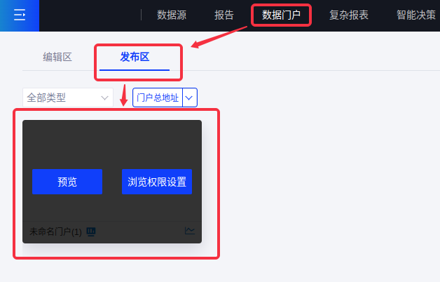(1)进入数据门户主页,在编辑区找到您制作的门户,鼠标hover后点选“发布”按钮;