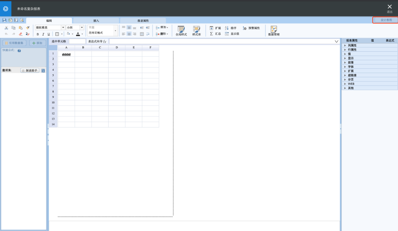 完成数据集的创建后,即可使用该数据集进行复杂报表的设计,详细功能及用户操作指导可点击右上角【设计教程】查看: