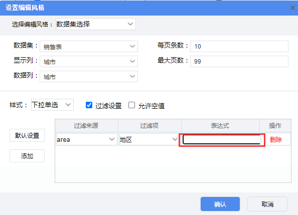 可以使用数据集选择编辑风格中的关联过滤功能。勾选【关联过滤】复选框,便可以设置与当前字段相关联的字段和过滤条件。