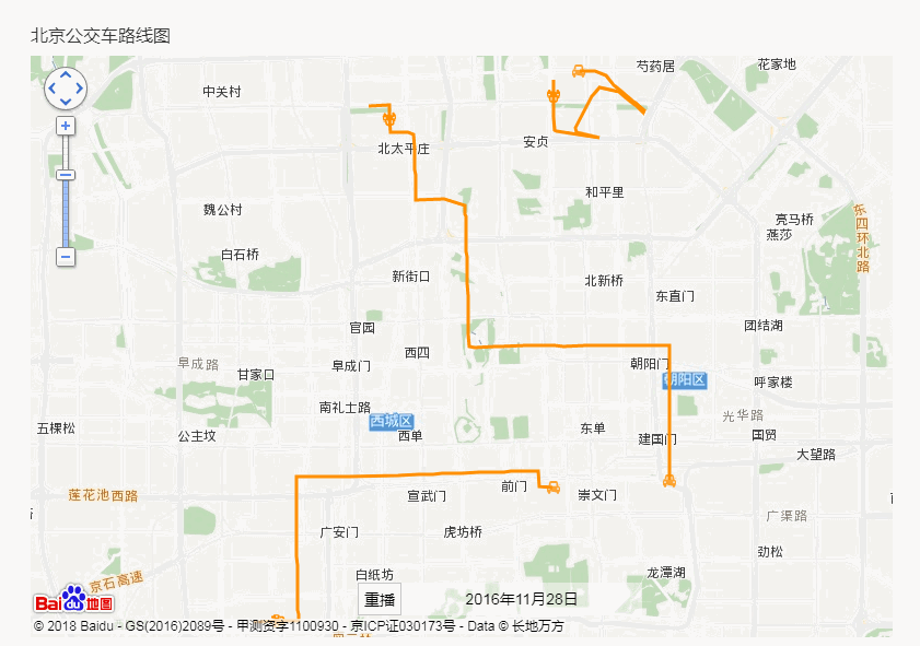 轨迹地图可以动态地展示物体(比如汽车)的运动轨迹,如图所示,显示的是北京地区某几条公交车的运行轨迹。