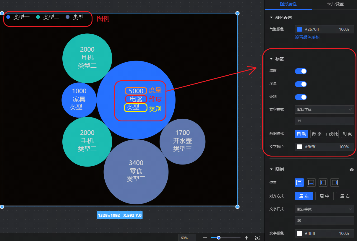 • 图例:设置气泡图是否要展示图例,以及图例的展示位置、文字样式。